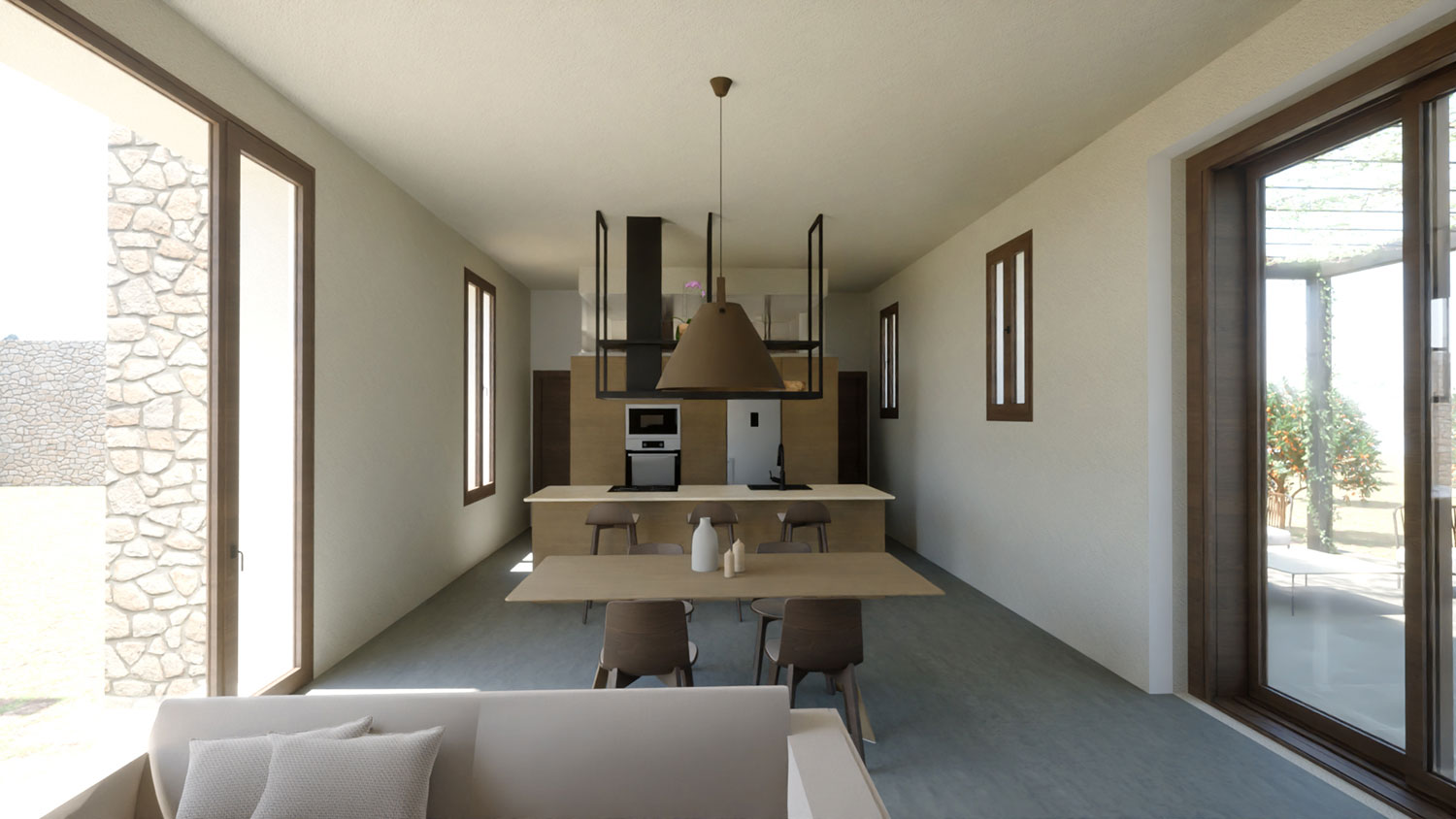 En el interior, se ha creado un espacio diáfano, luminoso y funcional, donde cocina y comedor se integran en un ambiente de líneas puras y materiales cálidos. Los grandes ventanales refuerzan la conexión visual con el exterior, multiplicando la sensación de amplitud y bañando cada rincón con luz natural.