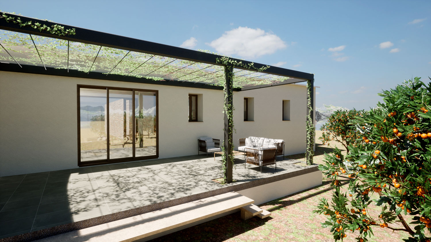 En el exterior, un porche con pérgola vegetal prolonga la vida de la vivienda hacia el jardín, generando un espacio intermedio que invita a disfrutar del clima mediterráneo en un entorno sereno y confortable.