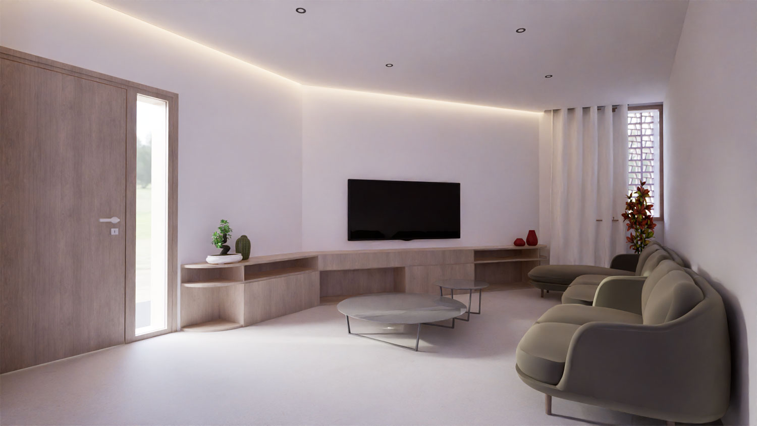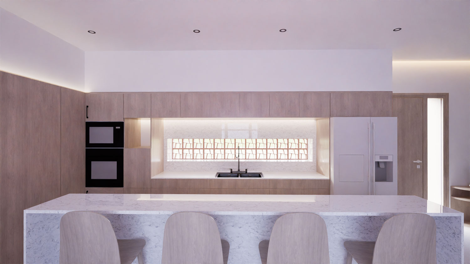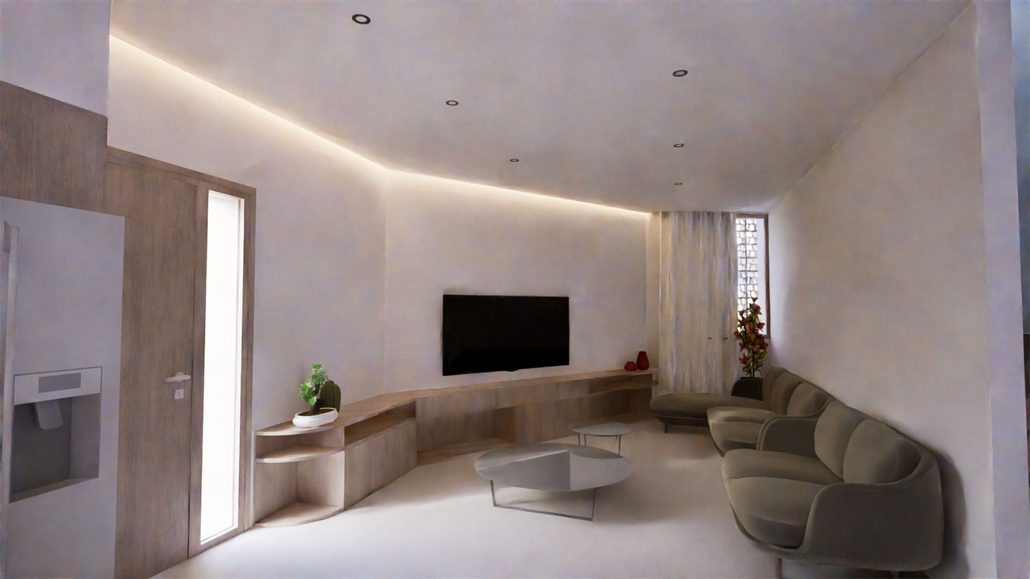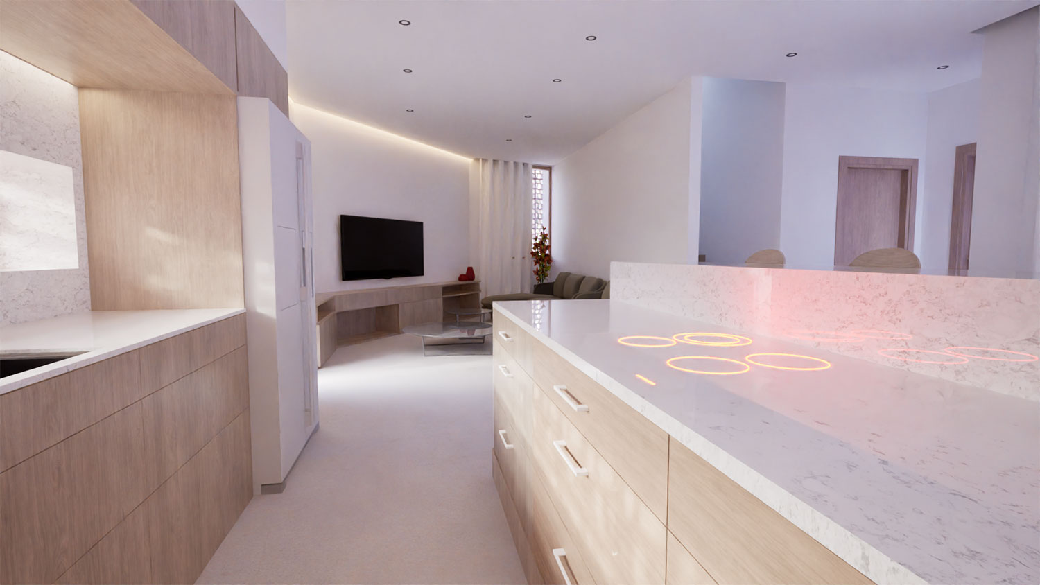La zona de día se organiza en un espacio abierto que integra cocina, comedor y sala de estar, potenciando la amplitud y la fluidez entre usos. La elección de tonos neutros y acabados en madera clara genera un ambiente acogedor y luminoso, donde cada detalle —desde la iluminación indirecta hasta el mobiliario a medida— está pensado para realzar la sensación de confort.